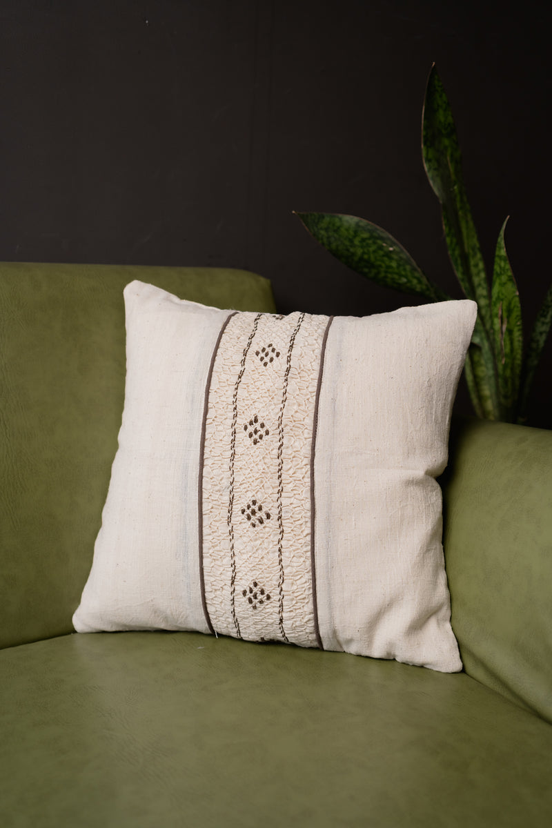 Add artisanal elegance to your space with this Handwoven Square Cushion, featuring a hand-smocked embroidered patch at its center. Crafted from 100% handwoven fabric, it offers intricate texture with contrast piping for a refined look. Its soft, neutral tones complement various interior styles.
