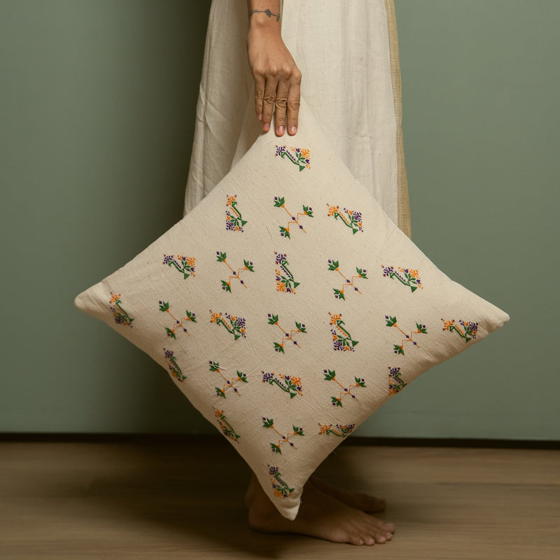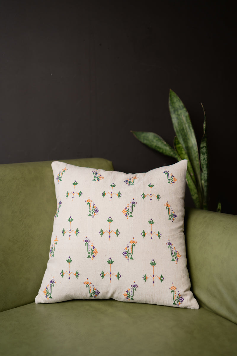 Experience traditional Gujarati artistry with the Zaad Moria handwoven Kala Cotton cushion cover. Featuring intricate hand embroidery of tree-inspired and peacock motifs in green, saffron, and violet on a natural ivory base, it blends cultural heritage with subtle elegance.