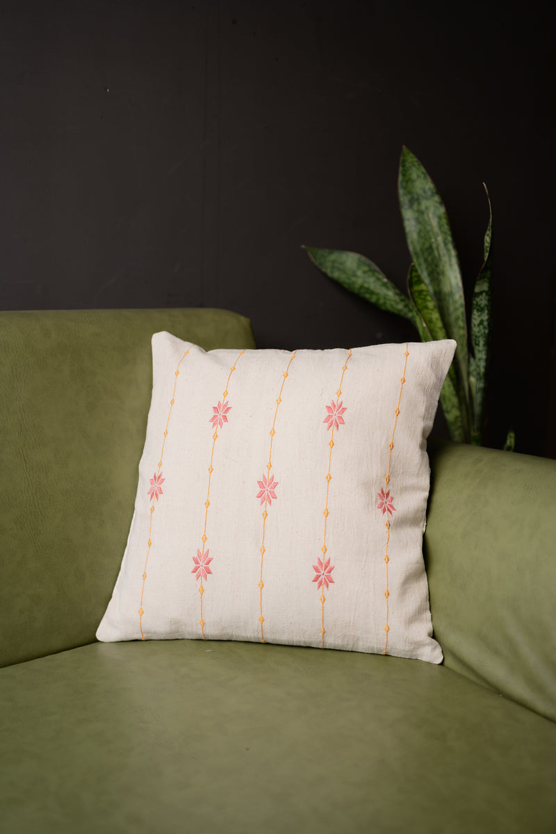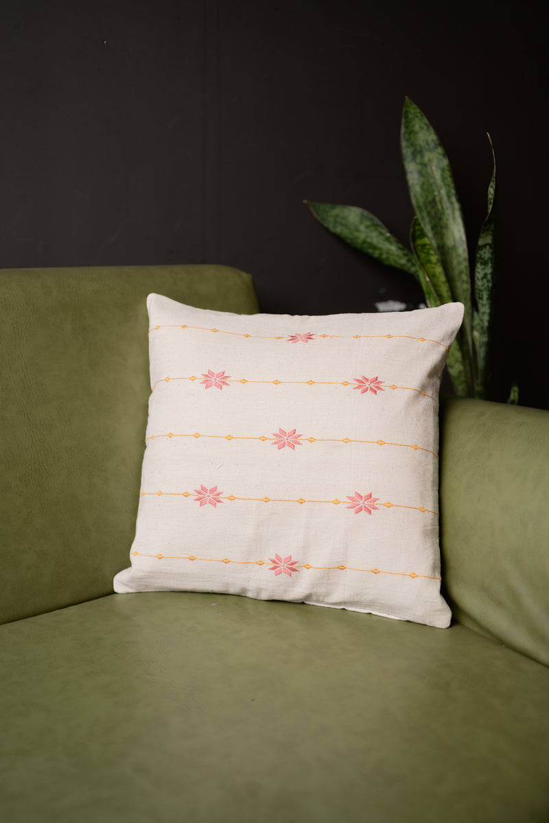 Elevate your home decor with this Handwoven Kala Cotton Cushion Cover, featuring traditional Soof hand embroidery and a detailed Chaki - Golda border. Its natural raw white base showcases intricate floral star motifs in pink sherbet, complemented by golden-yellow geometric embroidery.